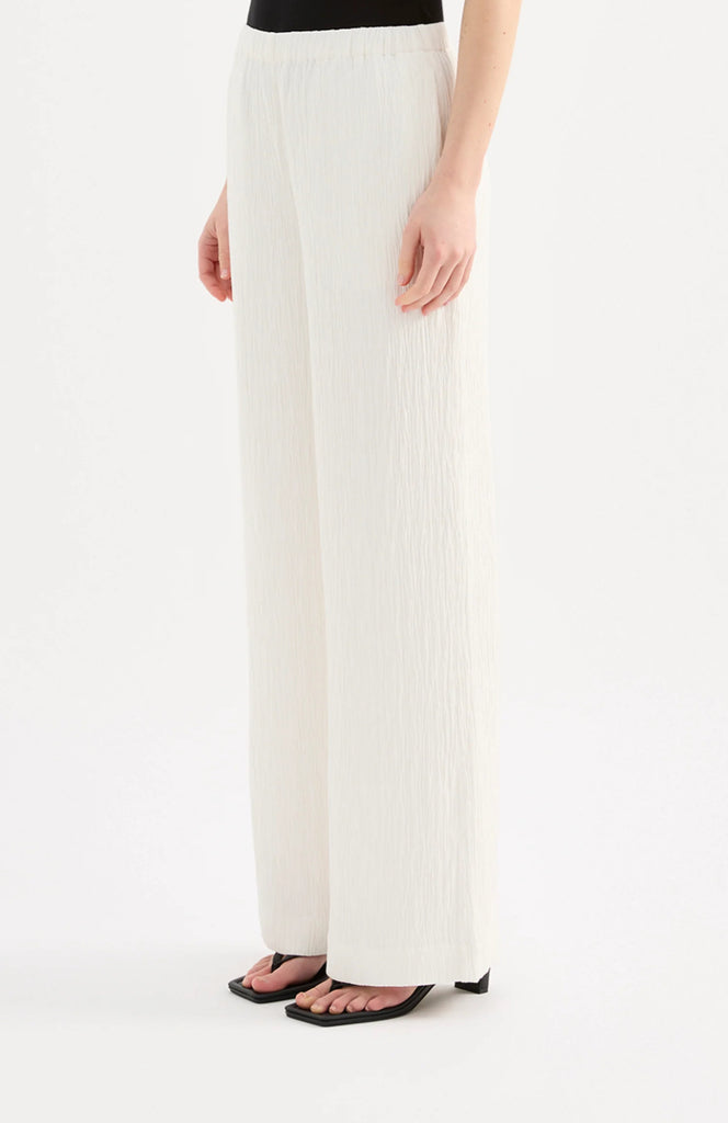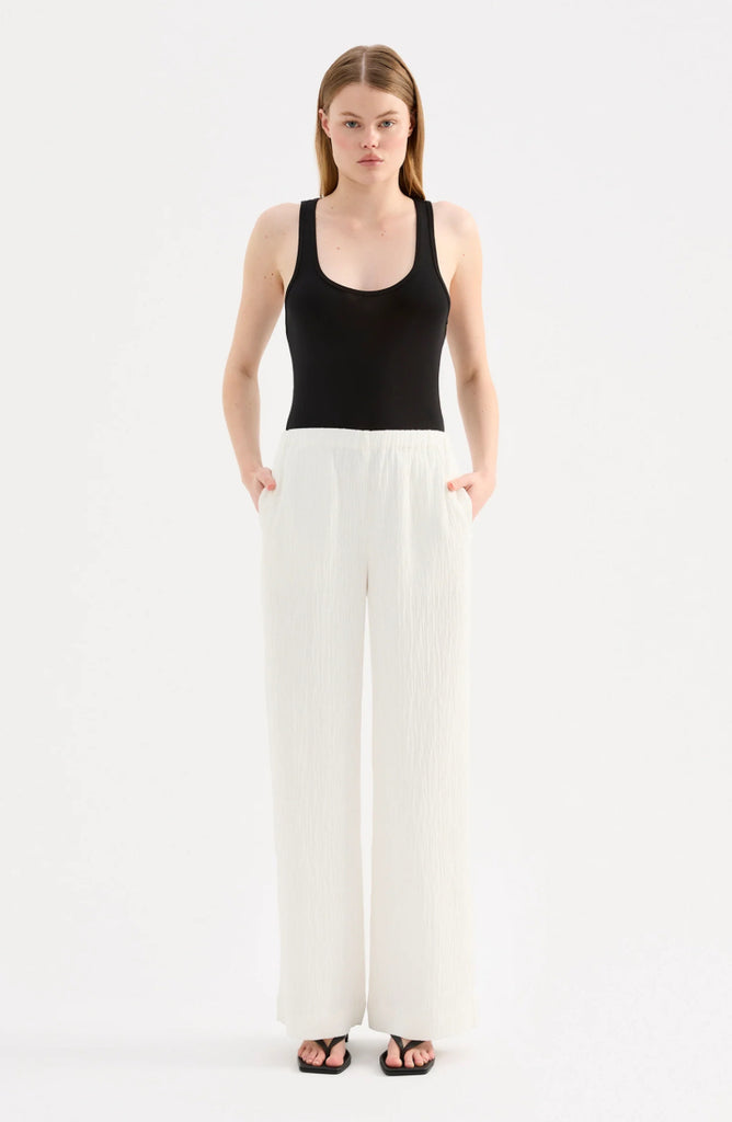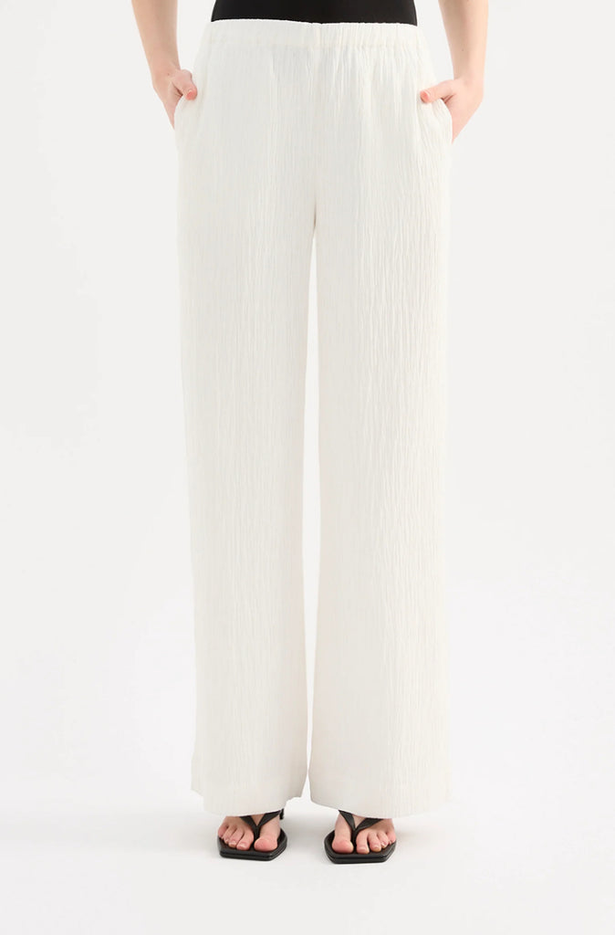 The Danika Pant is made from a crinkle textured fabric which has a dry, lightweight hand feel. The silhouette is relaxed with a straight, full length leg. Features include an elasticated waistband and side seam pockets.