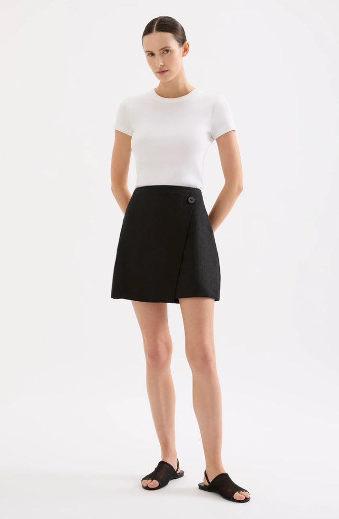 The Thilda Linen Mini Skirt in white is made from 100% linen which has been washed for a soft, breathable hand feel. The silhouette is high waisted and mini in length. Features include mock wrap front panel, mock shell button and invisible zipper at back. This skirt is fully lined.