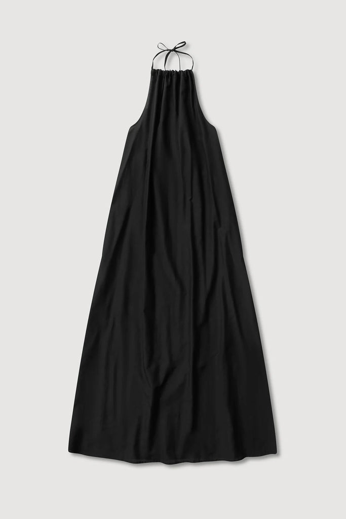 Halter neck maxi dress, crafted from a cotton and silk blend fabric, with a semi-sheer finish.