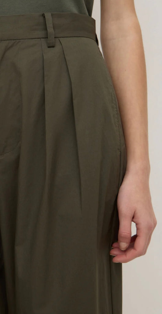 Crafted from 100% cotton, this pleat-front pant offers a cropped 3/4 length fit through the leg and a relaxed yet tailored silhouette. Features side pockets, back pockets and an internal drawcord for adjustability.