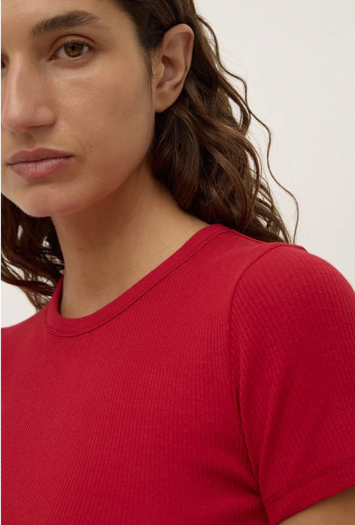 The Zali Short Sleeve Tee in mulberry is a 100% cotton ribbed fitted tee with a ribbed neckline.