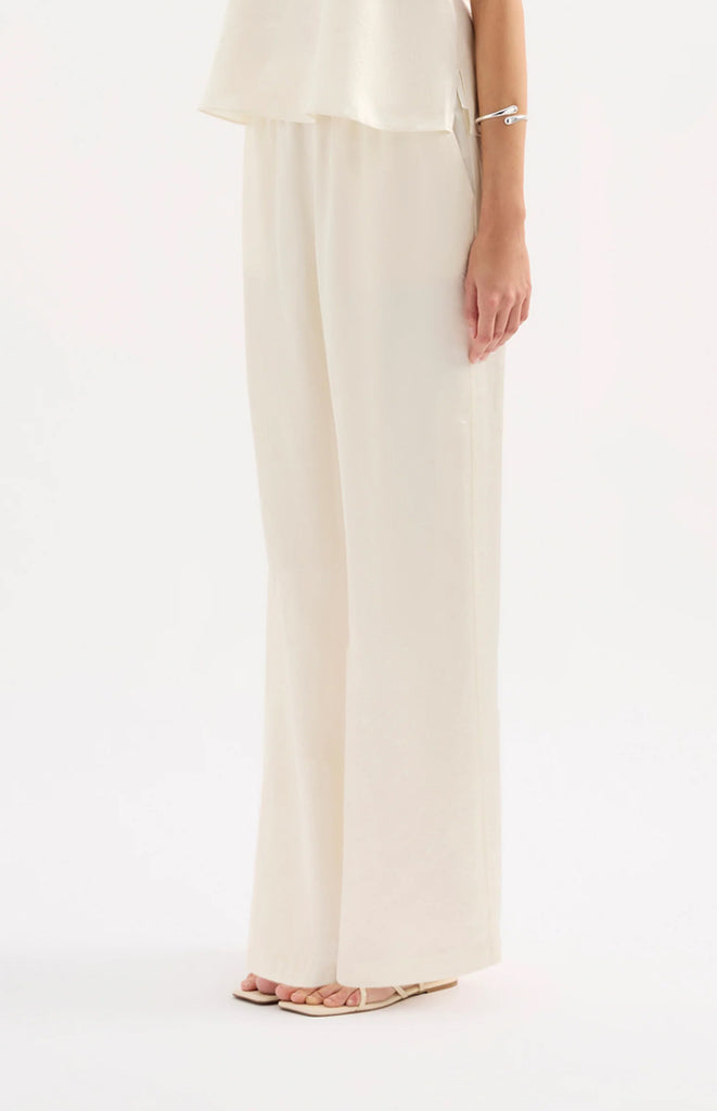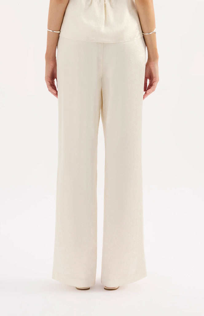 The Ana Pant is made from a premium crushed satin featuring a luminous, gloss finish and subtle crinkle texture. The silhouette is a wide leg, full length pant. Features include an elasticated waistband and side seam pockets.