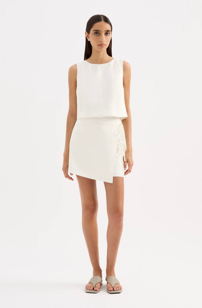 The Lotta Linen Mini Skirt in white is made from 100% linen which has been washed for a soft, breathable hand feel. The silhouette is high waisted and mini in length. Features include mock wrap front panel with yoke and double tie detail, and an invisible zipper at back. This skirt is fully lined.