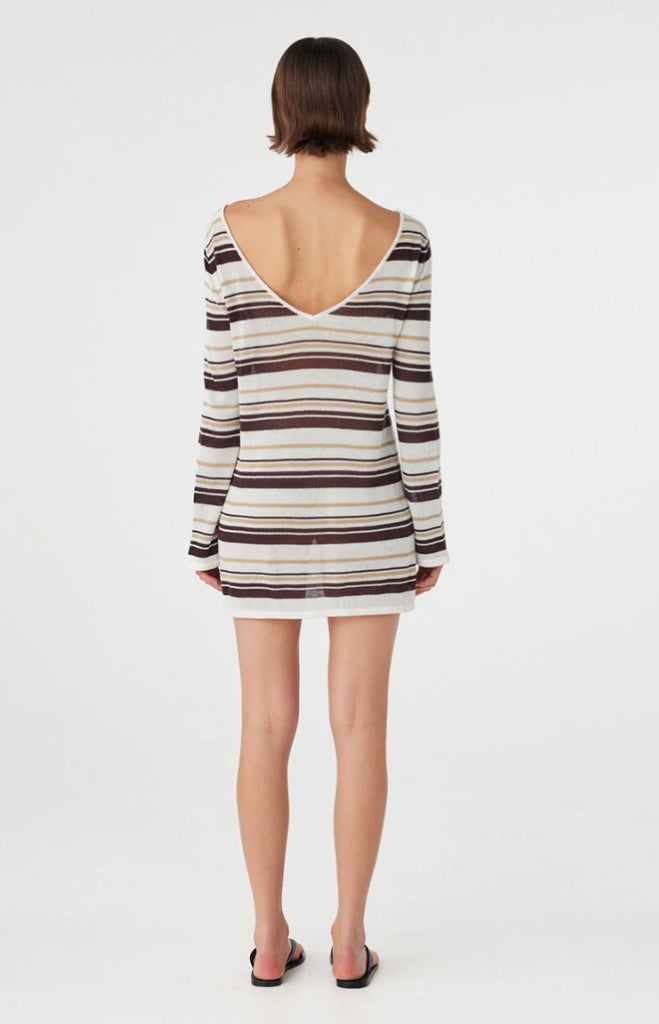 The Nia Long Sleeve Mini Dress in Cream Choc Stripe features a boat neckline and a loose, relaxed fit in a lightweight sheer cotton knit. Designed to layer effortlessly over swim, it’s an elevated beach-to-lunch essential that balances ease and texture.