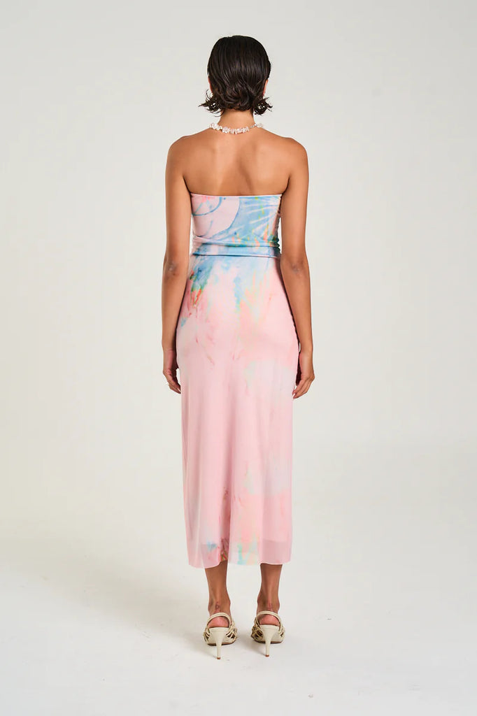 The strapless slip dress showcasing the Medusa Phase print in soft pastel hues features a form-fitting design with a double layered construction. It provides medium to sheer coverage and a flattering silhouette.