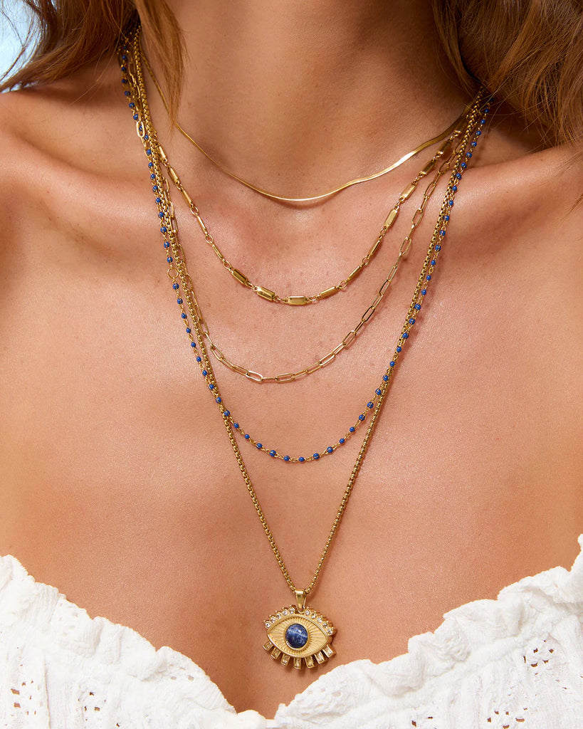 Statement, chill style comes naturally with the Zen Necklace, a pendant that brings calm and serenity to your everyday. This enchanting evil eye necklace features a lapis lazuli stone, a symbol of wisdom, protection, and strength, sure to guide you wherever you go. A beautiful choice for anyone who loves a bold yet effortless look.