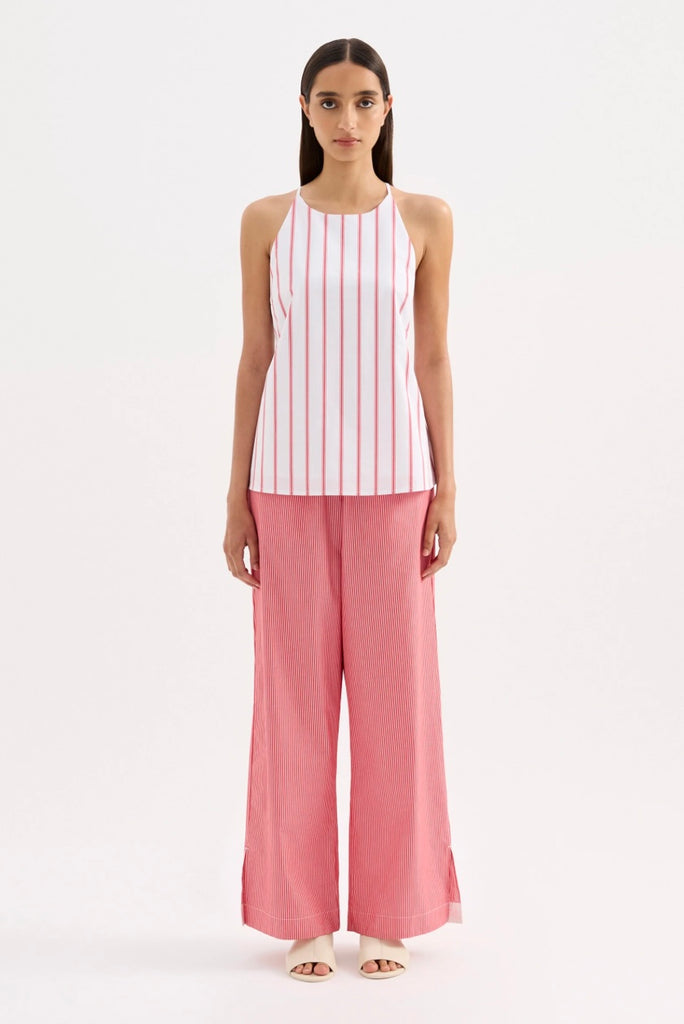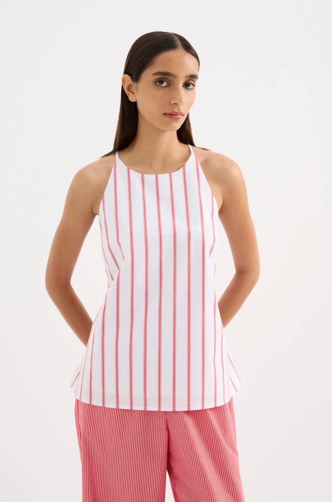 The Anouk Stripe Shirt is made from an organic cotton poplin which has be washed for a smooth, crisp hand feel in a bold white and red stripe. The silhouette is a feminine halter style with a low back. Features include adjustable thin straps that can be styled different ways and elasticated at back waist. The garment is fully lined.