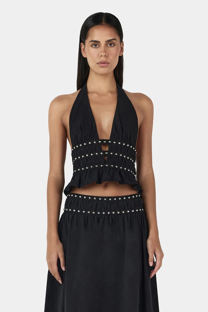 The Mavis Studded Top is a halter-style piece featuring an elasticated neckline, adjustable back ties, and a gathered bust for a flattering silhouette. A plunging neckline and silver studs along the bodice add an elevated detail. Pair with the matching Tabby Studded Midi Skirt for a complete look.