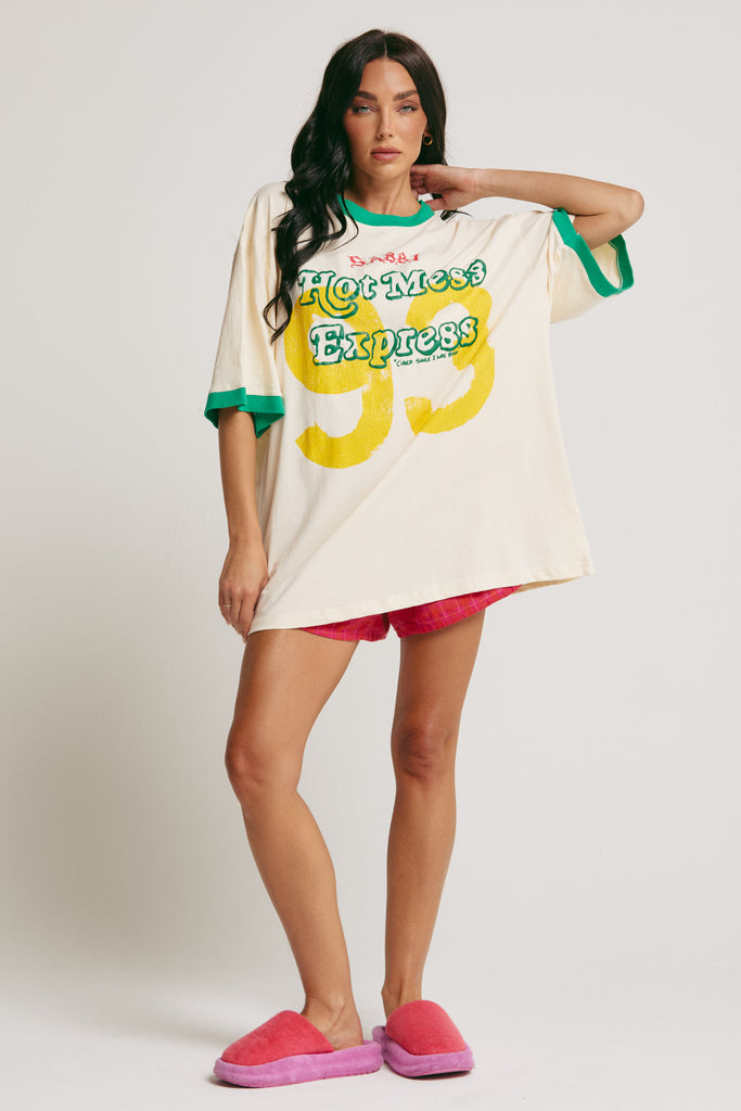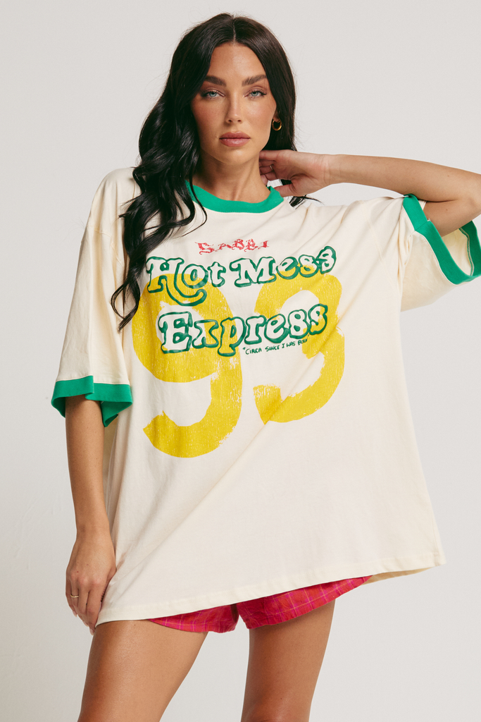 Cut in our signature very oversized silhouette, it drapes effortlessly and pairs perfectly with literally anything - lace skirts, denim, boardies, bike shorts or absolutely nothing (no judgement). With contrast neckline and sleeve detailing plus a large graphic print that does all the talking for you, this is your new throw-on-and-go hero.