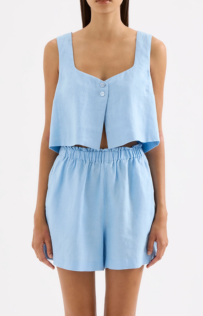 The Theo Linen Short is made from 100% Linen which has been washed for a soft, breathable hand feel. The silhouette is a high waisted clean casual fit with a wide leg opening. Features include an elasticated paper bag waistband and side seam pockets.