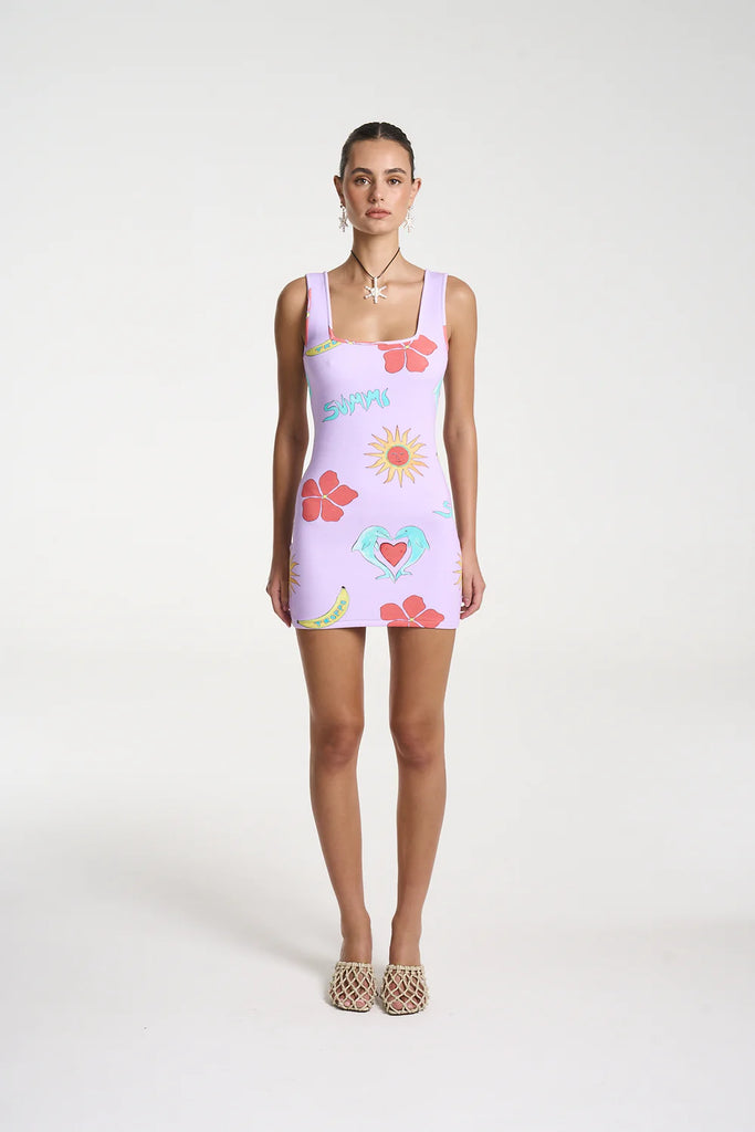 The Elle Mini Dress returns with refined style, showcasing the hand-painted TROPPO motifs against a lilac backdrop. Made from soft, stretchy cotton, it contours and supports the female form, complemented by wide straps for discreet coverage.