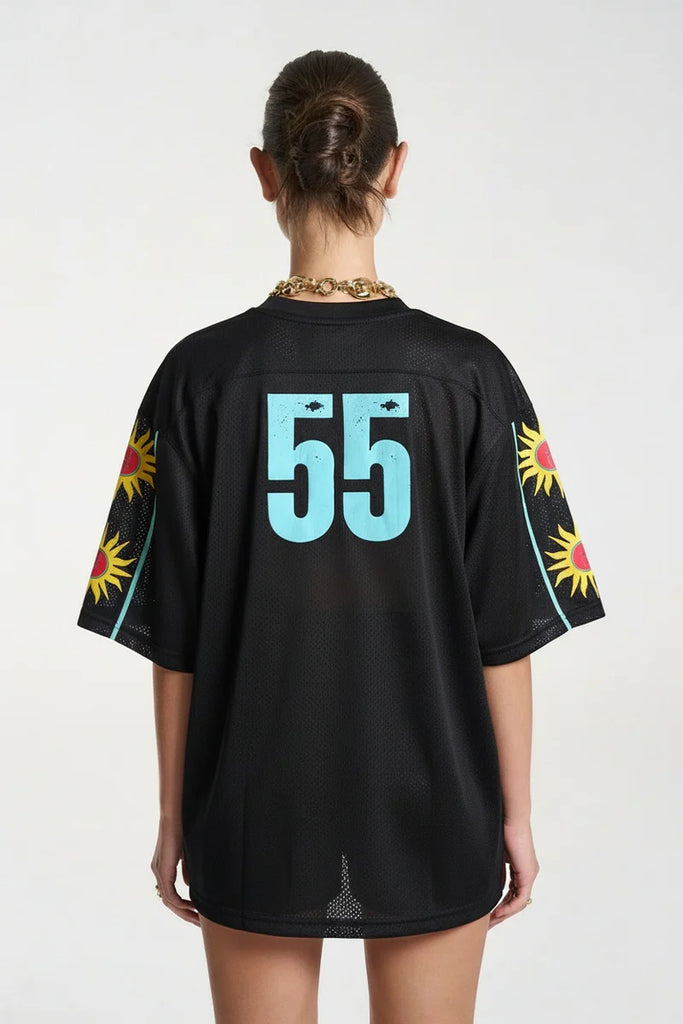 The Troppo Tee has been crafted from black pinhole mesh offering a relaxed fit and sheer airy finish. Stamped with Troppo text and bordered trim featuring the hand-painted Troppo sun.