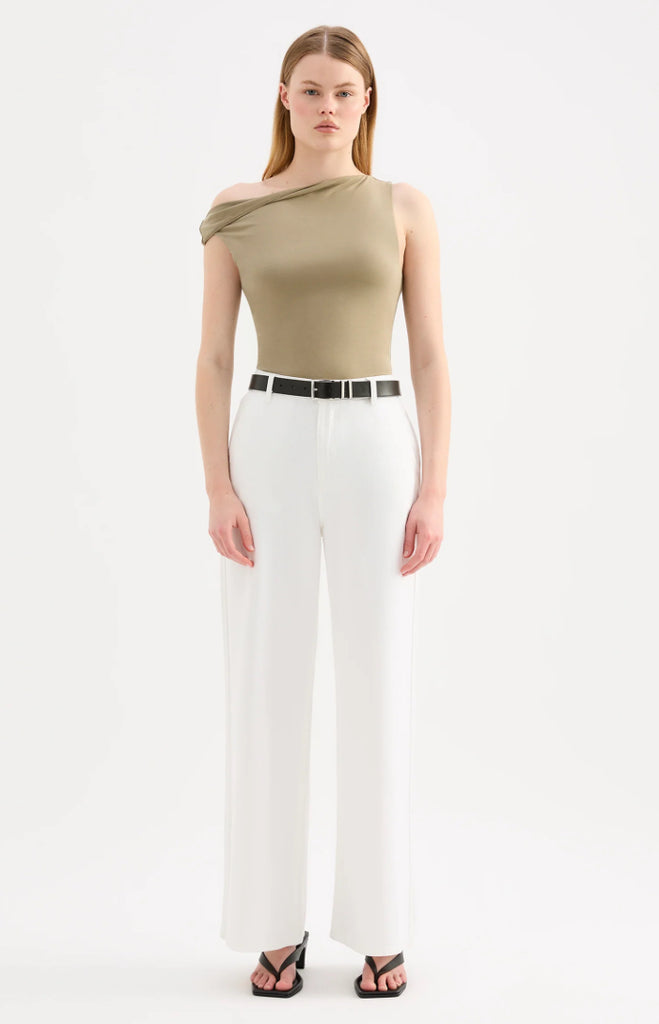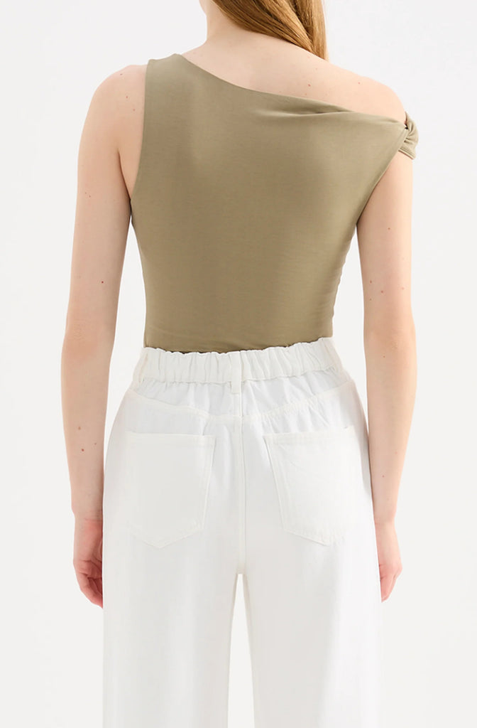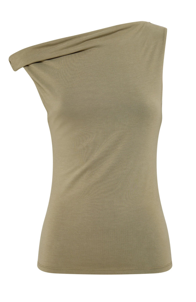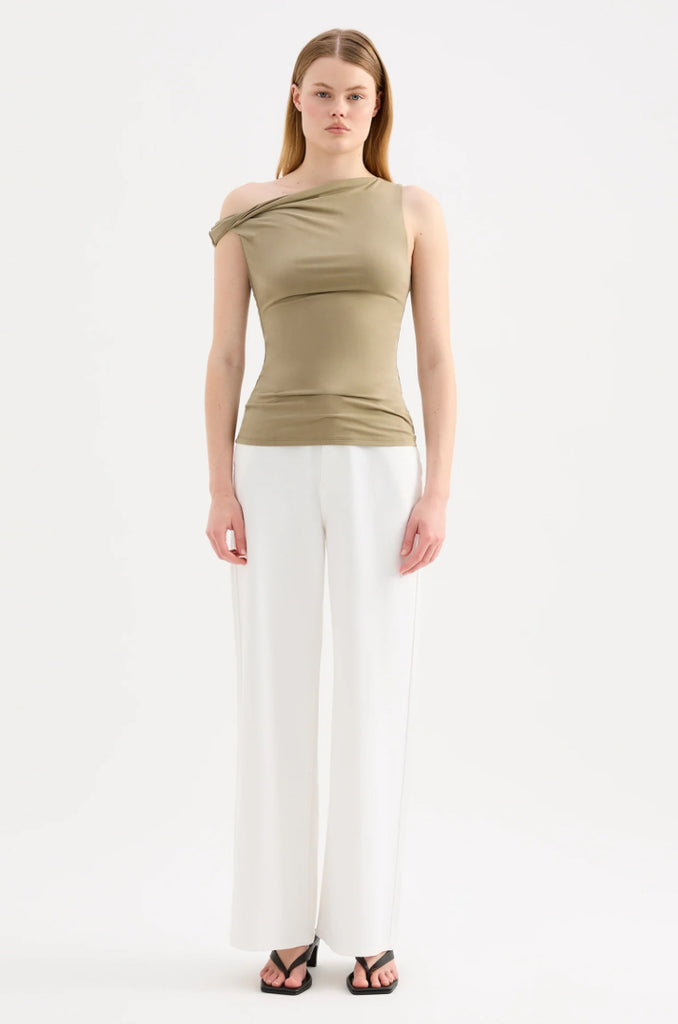 The Chelsea Top is made from a midweight modal fabrication which has a soft, slinky hand feel. The silhouette is a flattering close and finishes at the hips. Features include an asymmetric neckline, with a twist on the off shoulder sleeve.