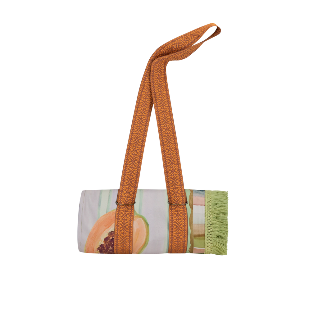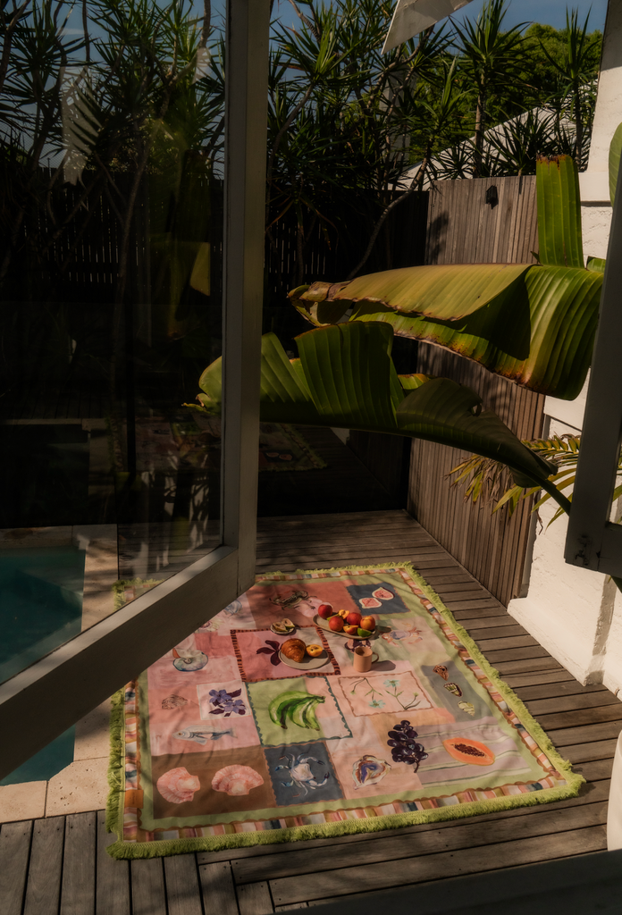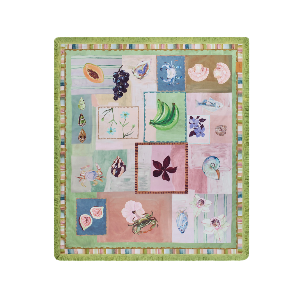 The Patchwork Sea Picnic Rug, is part of our Artist Series, featuring Annie Everingham’s hand-painted artwork. Painterly pastels and expressive brushstrokes capture the quiet magic of the seaside — shells, fruits, and tropical orchid motifs are thoughtfully patchworked together to create this dreamy coastal print.