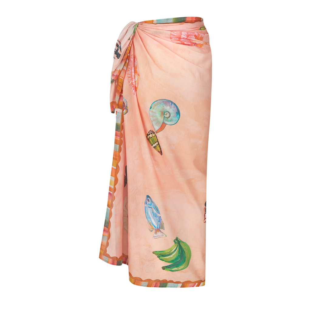 Our Pastel Sea Sarong is part of our Artist Series, featuring Annie Everingham’s hand-painted artwork. Painterly pastels and expressive brushstrokes capture the quiet magic of the seaside, shells, fruits, fish, and tropical orchid motifs layered over a soft peach-wash background. A colourful watercolour stripe border frames the artwork, digitally printed on a semi-sheer, lightweight cotton voile.