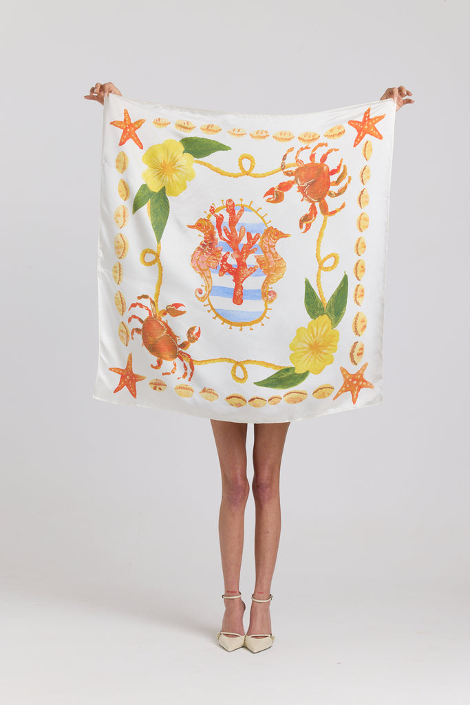 Effortless and fluid, the Coastal Scarf is a statement accessory designed to elevate every look. Crafted from a soft silk viscose blend, this oversized square drapes beautifully and moves with the body. Featuring our hand painted Coastal artwork, it can be worn as a headscarf, neck tie, top, or styled on the bag for an artful finish.