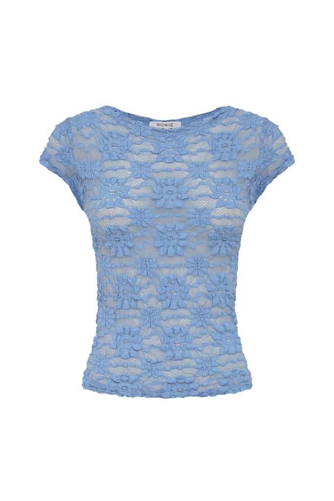 A cult favourite reimagined. The Galo Tee returns in sunflower stretch lace with a semi-sheer finish, cut to a baby tee silhouette with cap sleeves and a boat neckline.