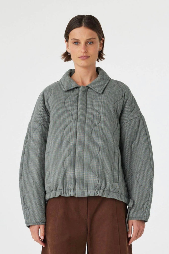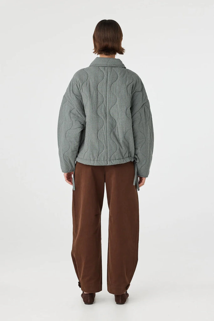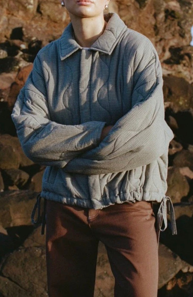 A quilted cotton jacket with a slouchy, cocoon shape, dropped shoulders and rounded sleeves give room for layers and movement. Concealed button front keeps the surface clean, with side pockets and a drawstring hem to pull in warmth or loosen for airflow.