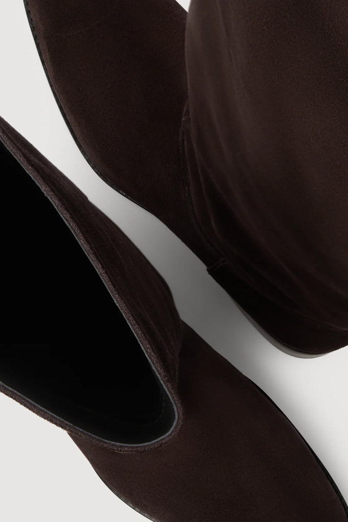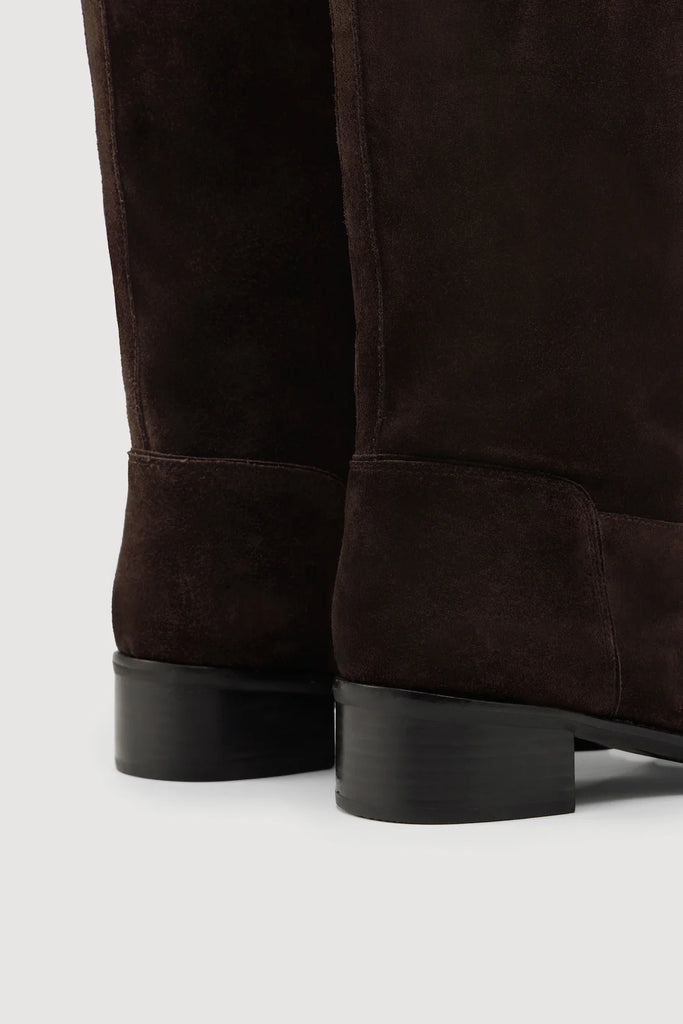 The Stevie Suede Riding Boot in ganache is a classic knee high suede boot with a rounded toe, wide opening, and lightly padded upper edge.