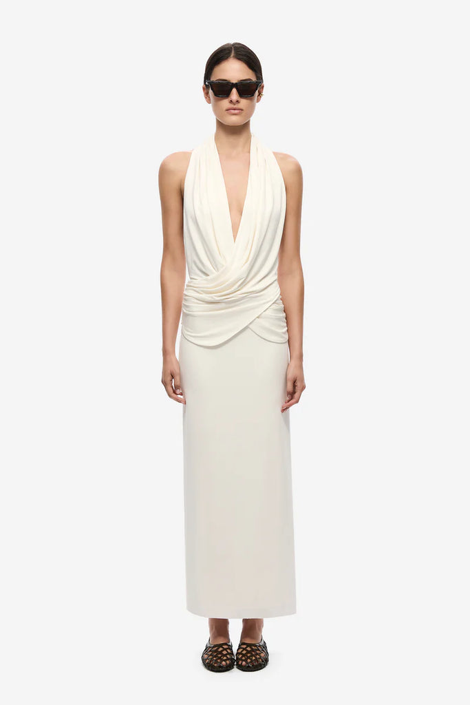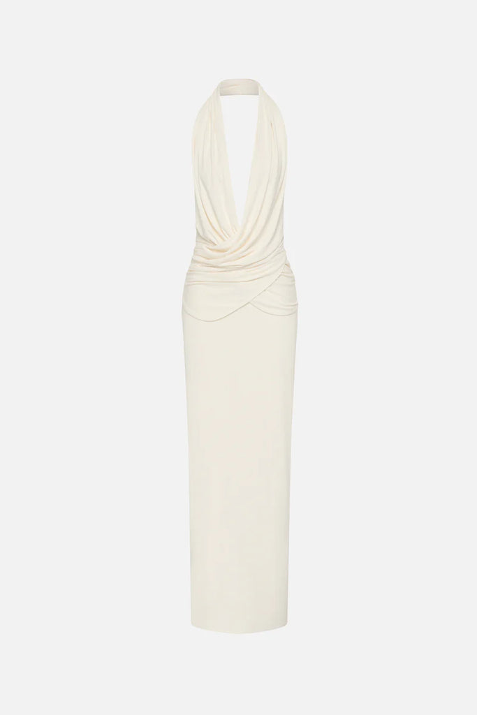Crafted in our signature cupro jersey fabrication, the Cabana Cupro Dress drapes effortlessly across the body. Featuring a halter neckline and drapping across the waist, this midi length silhouette evokes understanded elegance.